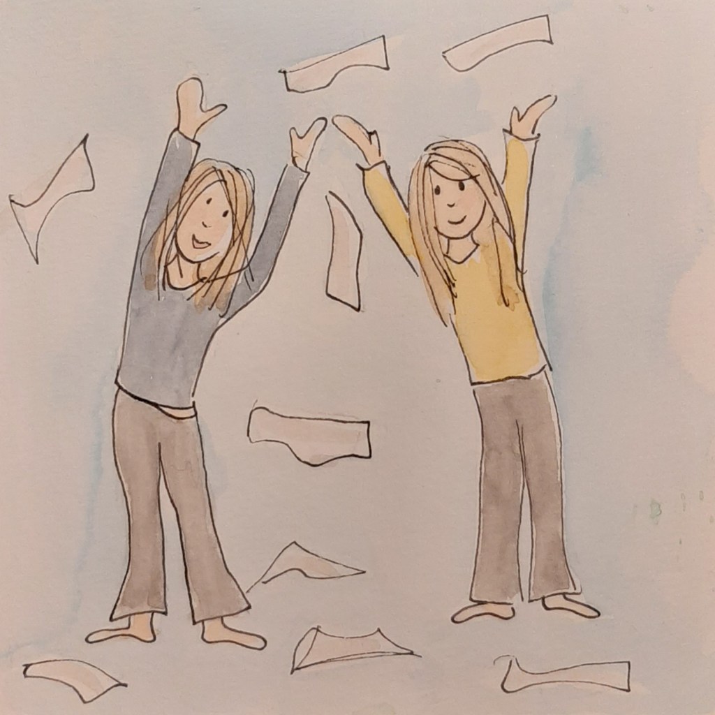 Meike en Janne willen een witte kerst. En wat heb je daarvoor nodig? Precies, kranten. ‘We ruimen het zelf op hoor mama,’ roept Meike. Zonder veel finesse wordt de krant in grote stukken gescheurd en over de vloer gesneeuwd. De benedenverdieping ligt bezaaid met krantenkoppen. “Vrij” “Voor versoepelingen moet álles meezitten” “Moeten er nu koppen rollen” “De familie achter Jumbo droomde al jaren van HEMA” “Alsof je écht uit eten gaat”