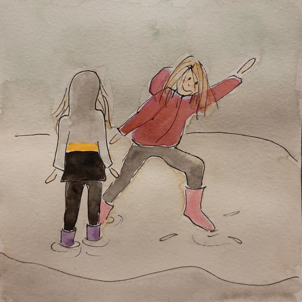 Meike wordt enthousiast wanneer er grote modderplassen in zicht komen. Janne heeft iets langer nodig. Bijna thuis springen ze allebei nog even in de grootste modderplas. Meike met soppende laarzen. Janne heel voorzichtig. Ook heel voorzichtig geeft Janne nu eindelijk toe. ‘Ik vond het tóch weer leuk,’ zegt ze. En uiteindelijk loopt ze de laatste meters toch met een glimlach op haar gezicht. Uiteíndelijk.