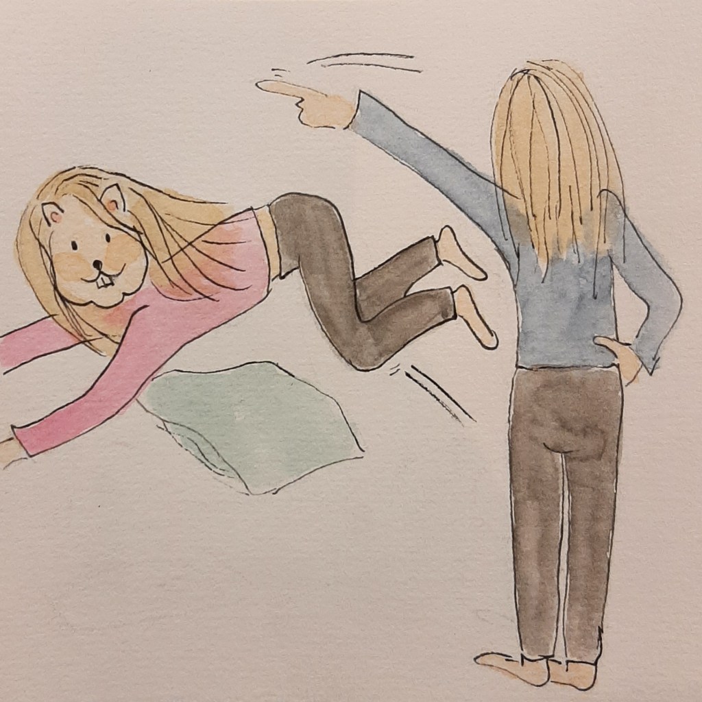 Ik speel ook vaak een rol. Niet altijd bewust. Zo werd ik net even terechtgewezen toen ik aangaf beneden te gaan stofzuigen. ‘Ahum, koningin, u bedoelt toch dat de bediende even gaat zuigen? En dat u daar even gaat kijken, zoals altijd?’ vraagt een streng kijkende prinses die ondertussen haar hamster ergens overheen laat springen.