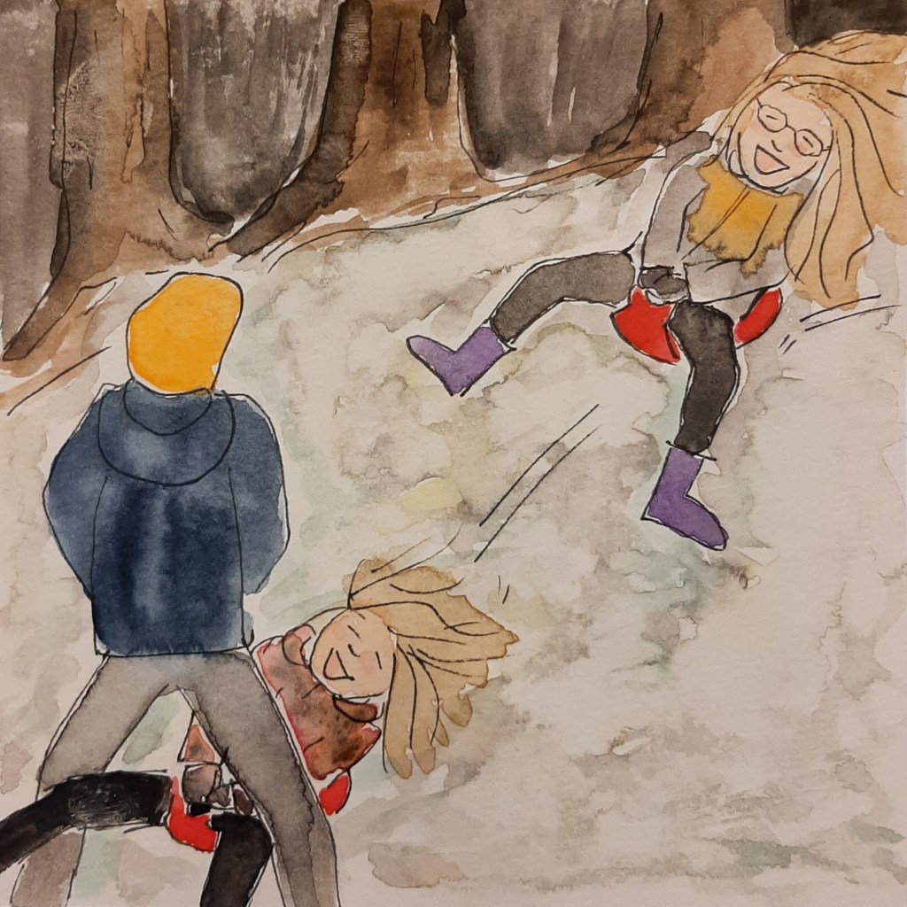 En toen ging het dus ook hier eindelijk toch sneeuwen. Wij grepen onze kans met volle handschoenen aan. Sneeuwballen gooien. In het donker. Een sneeuwpop maken. In het donker. Van de bosbulten in de tuin sleeën. In het donker.
