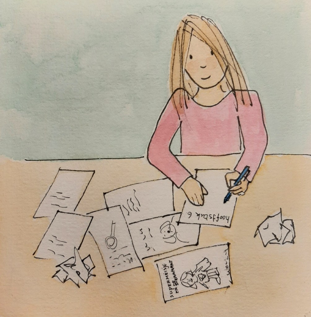 Ze stuitert door het huis. Helemaal in haar schrijvers-flow. Bij elke poging van mij om haar weer aan een schooltaak te krijgen, stuitert ze weer terug naar haar verhaal. ‘Ik kan me echt niet concentreren mama!’ legt ze uit. ‘Ik maak nieuwe boeken, de zon schijnt buiten, ik wil met Lizzy spelen… En dan moet ik schóólwerk doen!’ zegt ze gefrustreerd.