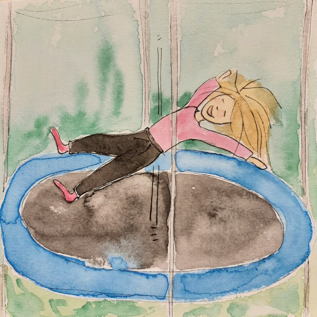 ‘Mama wat deed jíj vroeger altijd op de trampo?’ vraagt Meike. ‘Wij hadden geen trampoline,’ antwoord ik. ‘Huh? Bestonden die toen nog niet?’ vraagt ze verbaasd. ‘Nou, misschien bestonden ze wel, maar ik kende geen mensen die er zelf een hadden,’ zeg ik. Ze kan het bijna niet geloven. Een wereld zonder trampoline. ‘Dus jij weet helemaal niet hoe dit voelt? Dat je zo kunt vliegen?’ zegt ze met medelijden. Ze doet voor de zekerheid nog even voor hoe je, wanneer je hoog springt, een horizontale vrije val kunt maken. Ik durf niet.