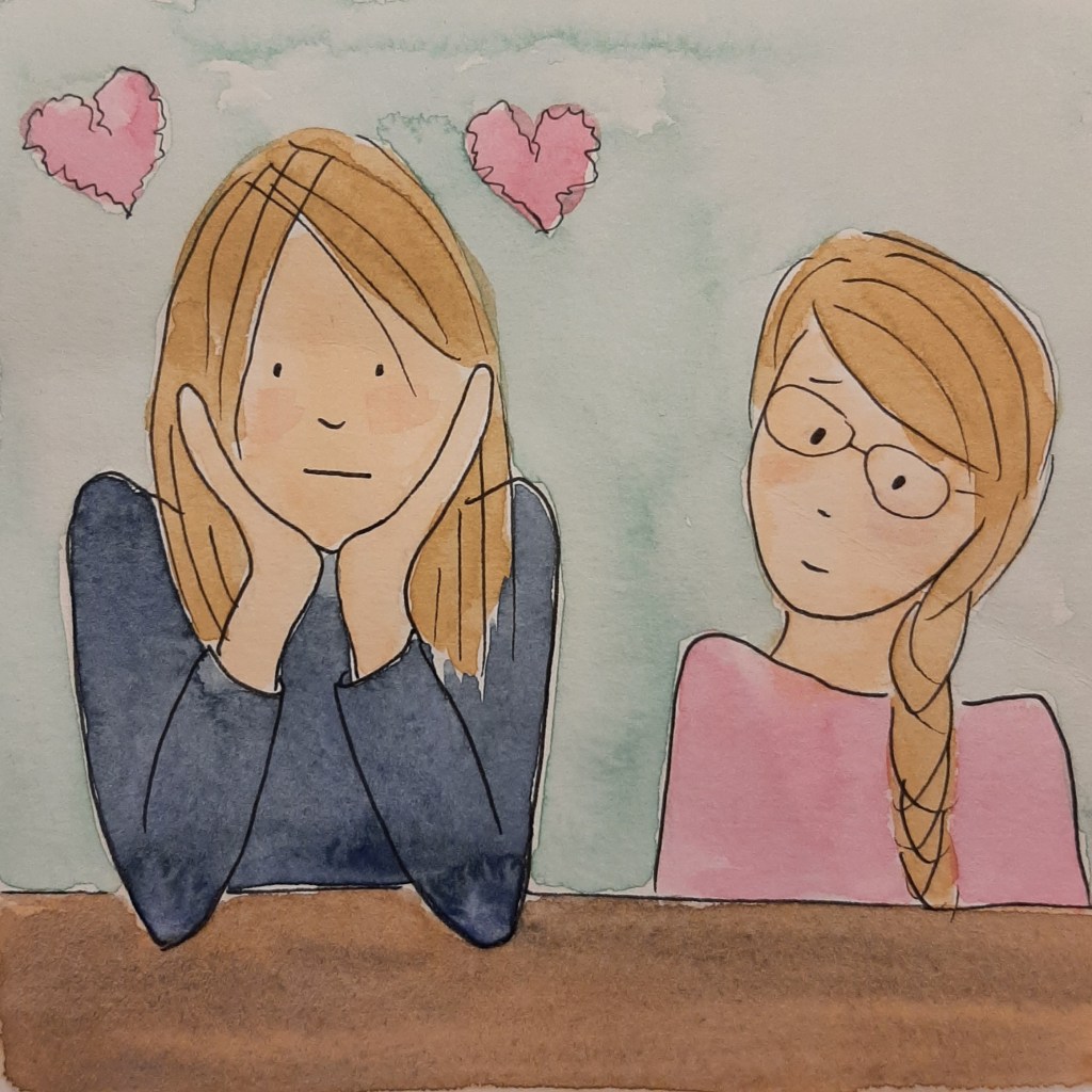‘Mama, deze dag is me echt een beetje aan het pesten,’ zucht Meike. ‘Hoezo?’ vraag ik. ‘Eerst hebben we het over liefde op school. En nu een filmpje over liefde…’ zegt ze met een diepe zucht. ‘Dat snap ik niet,’ zegt Janne. ‘Snap jij dat mama, hoe een dag je kan pesten?’ ‘Omdat ik ook op iemand verliefd ben,’ legt Meike haar zusje uit. ‘Maar ik denk dat diegene niet verliefd is op mij. Wie is er nou verliefd op mij?’