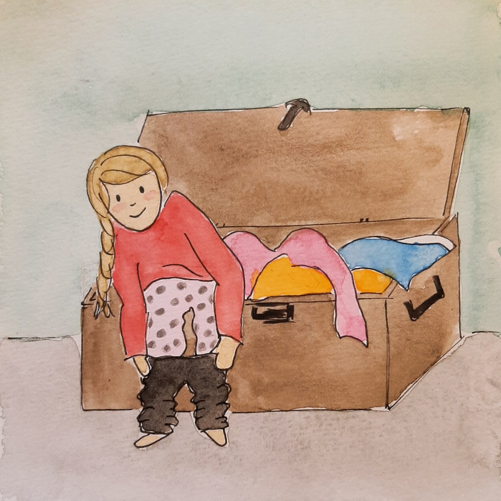 ’s Middags uit school gaat ze met de verkleedkleren spelen met vriendinnen. Wanneer ze haar stretchjeans uittrekt, blijkt daar een pyjamabroek onder te zitten. Lichtroze met zwarte stippen. ‘Oja, die was ik nog vergeten!’ zegt ze lachend. ‘Ja, jij had vanmorgen alleen de bovenkant van mijn pyjama gezien mama!’ zegt ze schuldbewust.