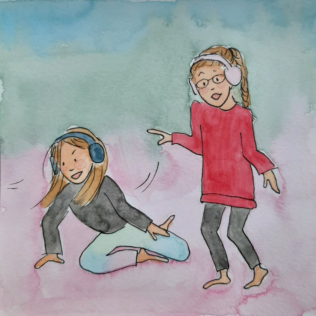 Zonder snoertje zijn ze via bluetooth te koppelen aan de tablet. Met Spotify. ‘Mam!’ schreeuwt Meike. ‘Ik heb ontdekt dat ik hele vette dansmoves heb! Kijk!’ Al zingend en schreeuwend laat ze haar nieuwste moves zien. ‘Mama dit liedje ken ik!’ schreeuwt ook Janne daar weer dwars doorheen. Silent disco. Met heel veel bijgeluid. Lekker rustig.