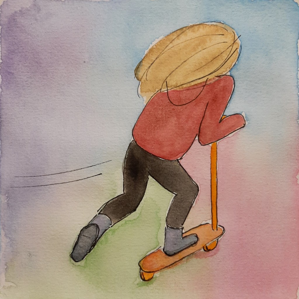 ‘Mama, ben ik een kruising tussen papa en jou?’ vraagt Meike terwijl we onderweg naar school zijn. ‘Ja,’ zeg ik. ‘Dus…’ begint ze, ‘vrijheid en kunst. Dat is perfécte kunst. En… gevaar en angst. Dat is snelheid!’ concludeert ze treffend en zoeft met flinke vaart weg op haar step. Ken uzelf.
