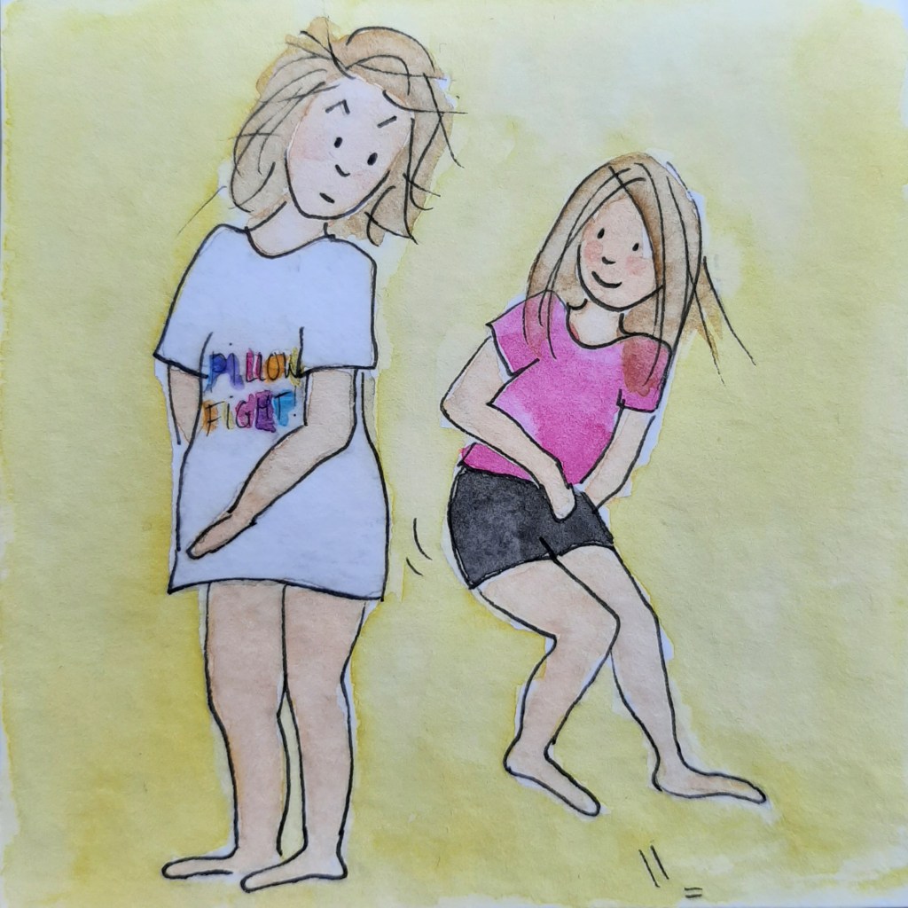 ‘Mama, wat een leuke pyjama,’ zegt Meike. Ik bekijk wat ik aan heb en roep al voorlezend: ‘pillow fight!’ ‘Ja!’ roept Meike ook enthousiast. Ik probeer me vast te beschermen tegen een vliegend kussen, maar krijg twee billen tegen mijn billen gebumd. Ik kijk haar verbaasd aan. ‘Billo five!’ roept ze. ‘Dat wordt onze nieuwe handshake!’ besluit ze ook maar direct.