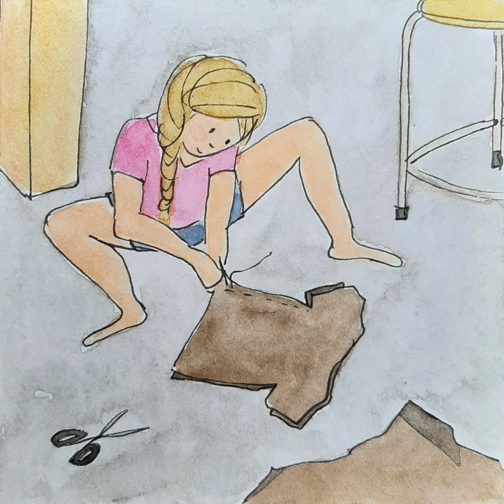 Janne bleef een dagje thuis vandaag. Nog even wat extra uitrusten, zodat ze ook de belangrijke momenten van de laatste schoolweek mee kan doen. En aangezien ik aan het naaien was, ging zij ook aan de slag met stof, naald en draad in mijn atelier.