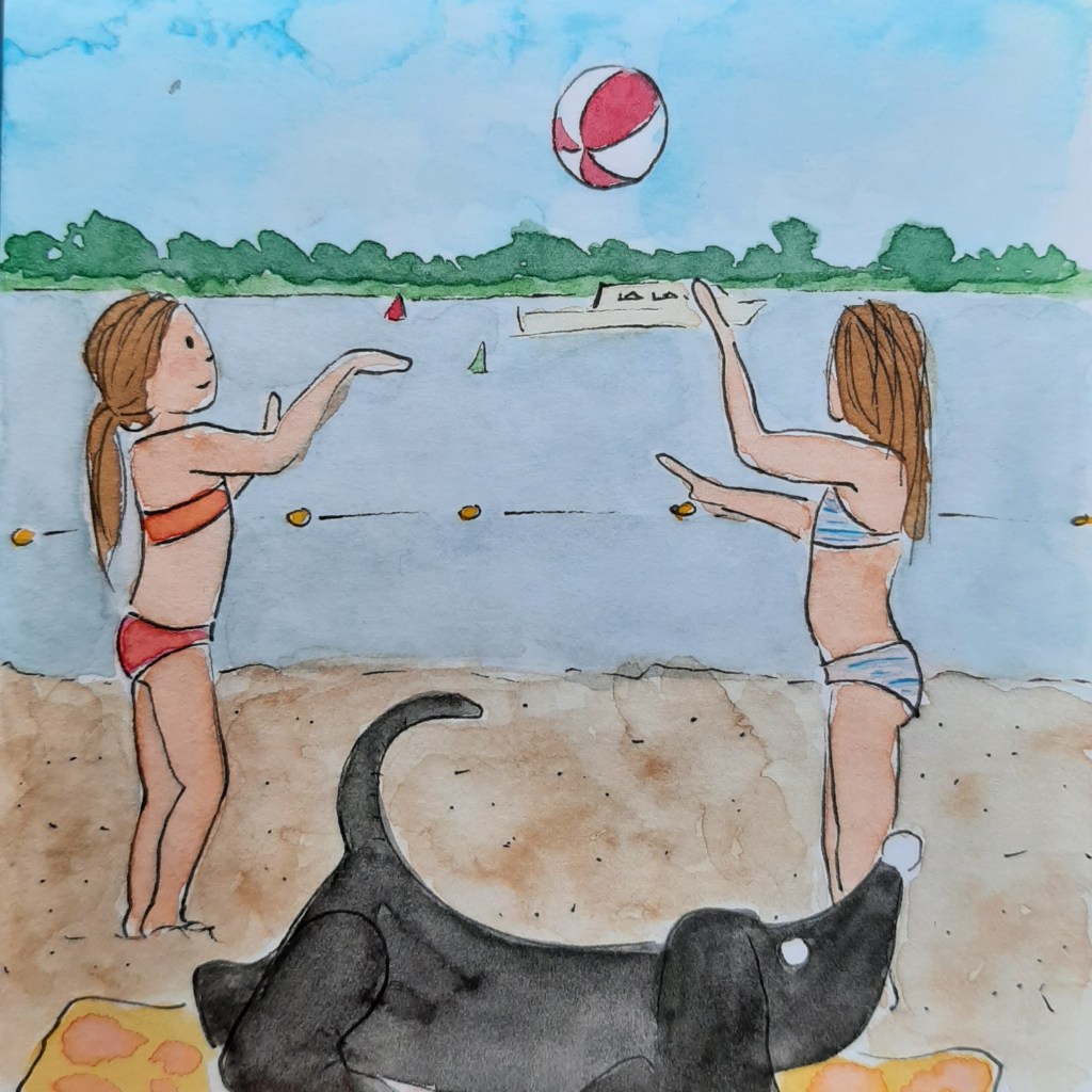 Hij heeft heerlijk gezwommen. Met de bal gespeeld. In de zon gelegen. Iedereen tevreden. En ik laveer zo netjes tussen ieders wensen.