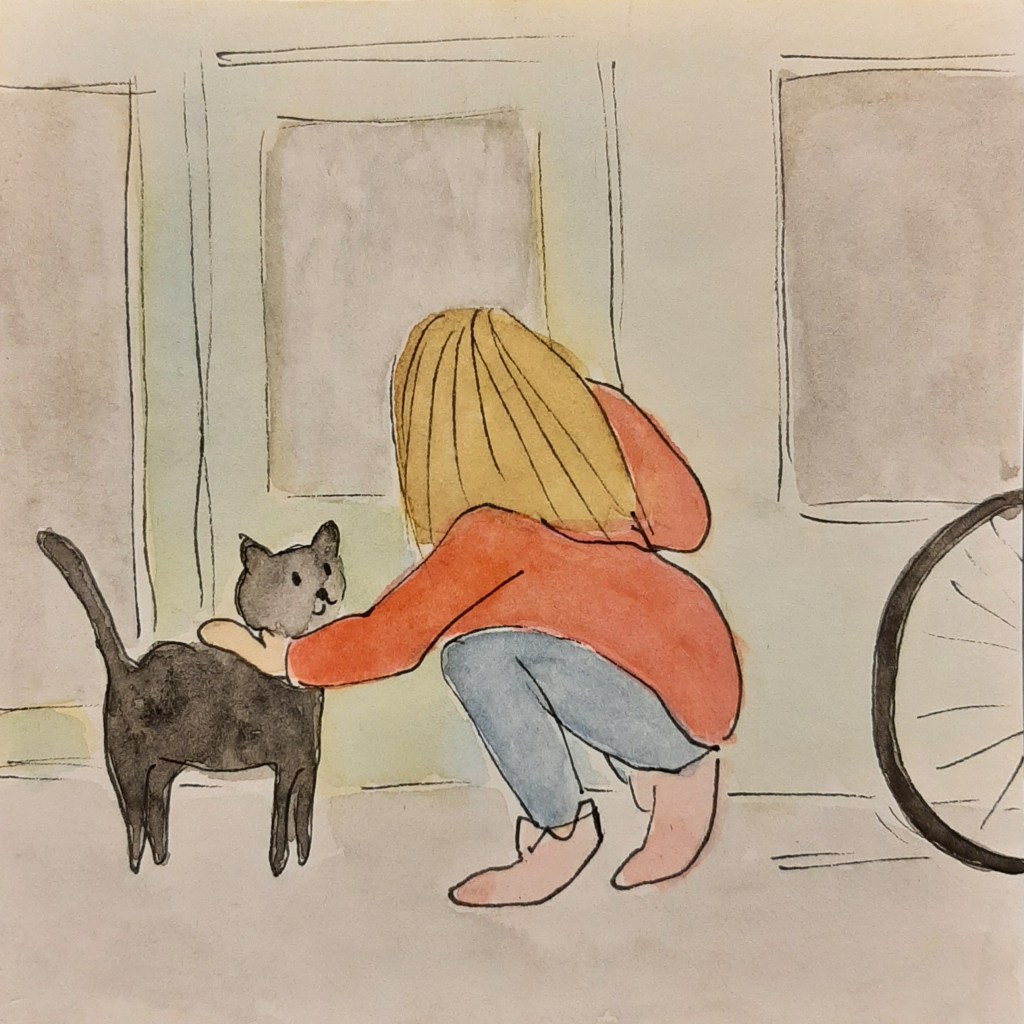 Blij dat ze op tijd op school is, spoor ik haar aan snel haar fiets weg te zetten en naar binnen te gaan. Wanneer ze op het nippertje de school in wil lopen, loopt er een kat langs die geaaid wil worden. Ik geef het op. Dit is overmacht. Het is tenslotte dierendag.