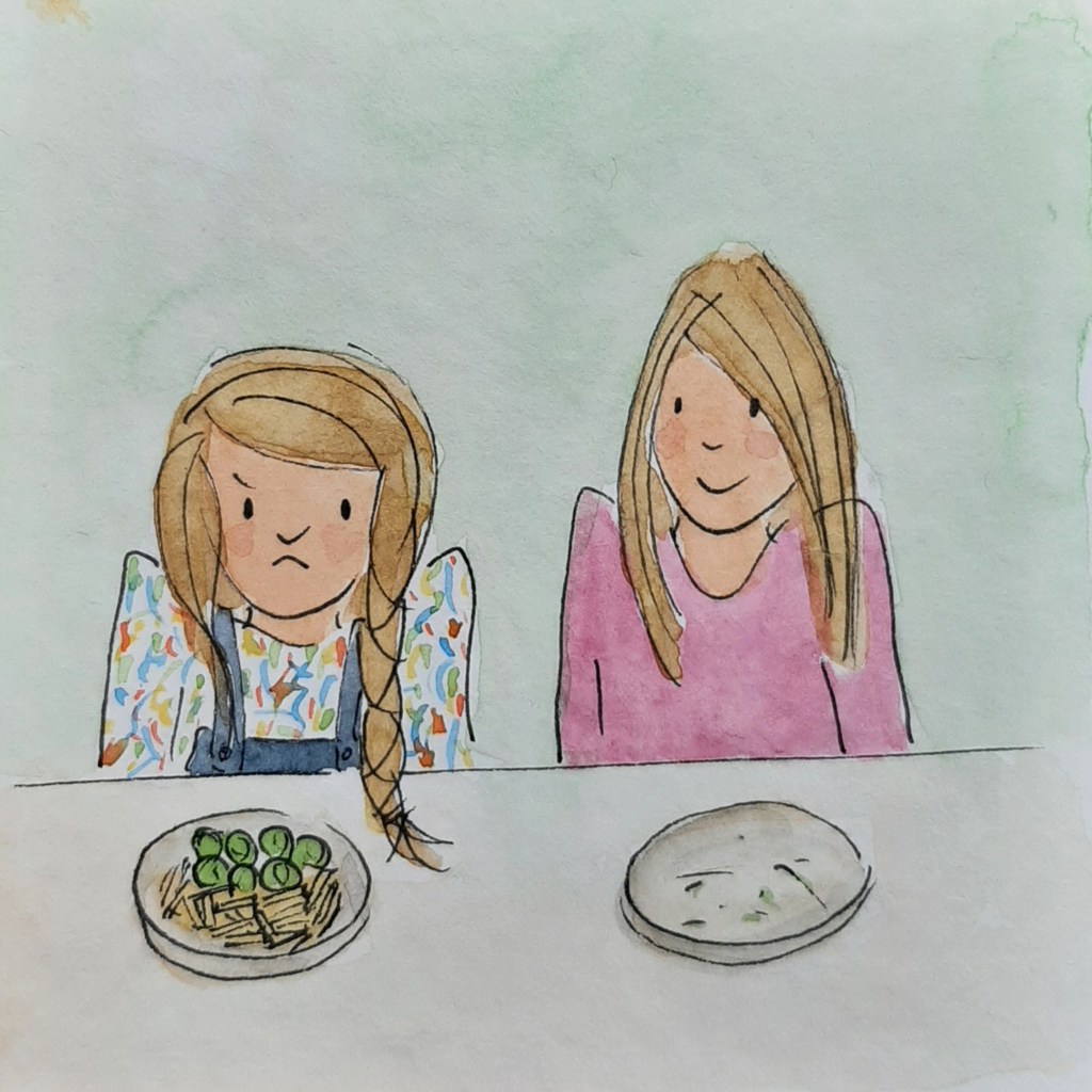‘Mam, wat gaan we eten?’ vraagt Janne. Ik zet me schrap. ‘Pasta, makreel en spruitjes,’ zeg ik dapper. Ik pak direct door. ‘Als jij goed spruitjes eet, dan hebben we vanilleijs als toetje,’ zeg ik. Het is even stil. ‘Ok. Dus als ík niet goed spruitjes eet, krijgt Meíke geen toetje,’ concludeert ze snel. ‘Euh, ja,’ beaam ik. Ondertussen hopend dat ze op dit moment op goede voet staat met haar zus. Een gokje. ‘Ok, dan ga ik goed mijn spruitjes eten,’ besluit ze dapper. ‘Ik wil niet dat Meike verdrietig wordt.’ Pfieuw!