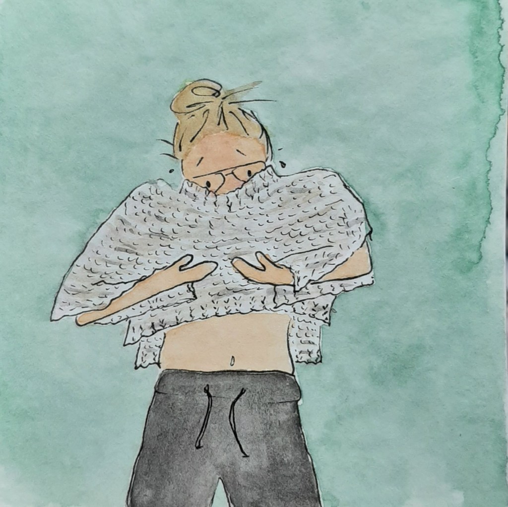 Mijn allereerste zelfgebreide trui is bíjna af. Ik moet de laatste naden nog dichtnaaien. En ik heb al gezien dat het bestwel spannend gaat worden. Het lijf is breed genoeg. De mouwen zijn lang genoeg. Mijn hoofd past net door de halsopening (zelfs met bril op). Maar of die armsgaten ruim genoeg zijn?