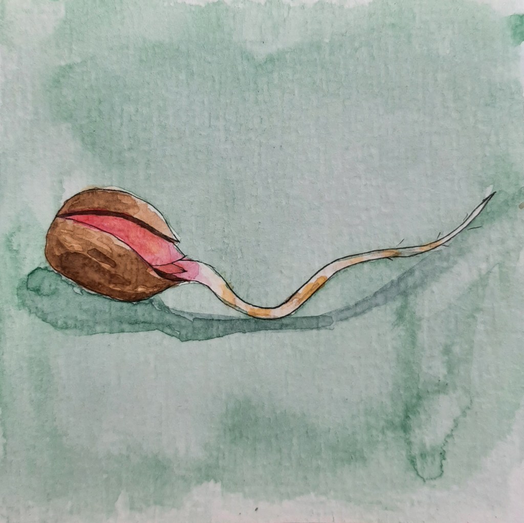 Ik ga in ons bos op zoek naar eikels voor eikeltjesinkt. Hoewel er heel wat eikels door de eekhoorns zijn opgegeten, en er ook heel wat verrot zijn, zijn er nog genoeg te vinden. Ik vind zelfs een mooie ontspruitte eikel. De schil opengebarsten, een prachtige fel rood-roze kleur die daaronder verschijnt, en een lange witte wortel eraan.